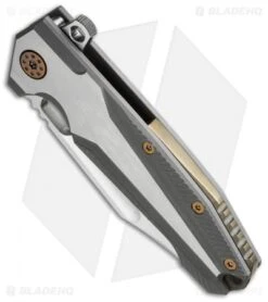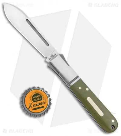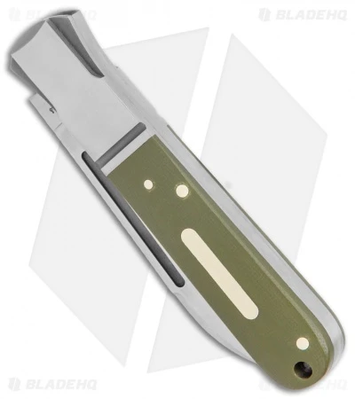 - Stainless steel handle with green G-10 scales, brass hardware, and a lanyard hole.