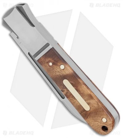 - Stainless steel handle with wooden scales, brass hardware, and a lanyard hole.
