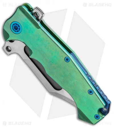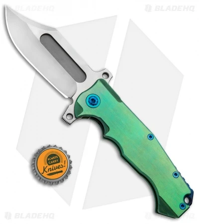 This model of the Andre de Villiers Badlands features a satin finished bowie blade made from heavy duty D2 steel. The titanium handle has a green anodized finish with blue hardware and titanium backspacer.