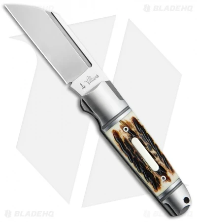 This Pocket Butcher features a D2 tool steel blade with a satin finish and a bead blasted finger groove along the length of the blade for easy opening. Its handle sports a classic stainless steel bolstered design with burnt stag inlays and a lanyard hole. Includes a padded velcro pouch.