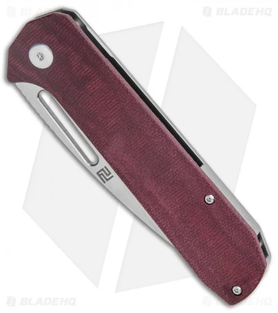 - Coral red micarta handle with a bead-blasted titanium frame.